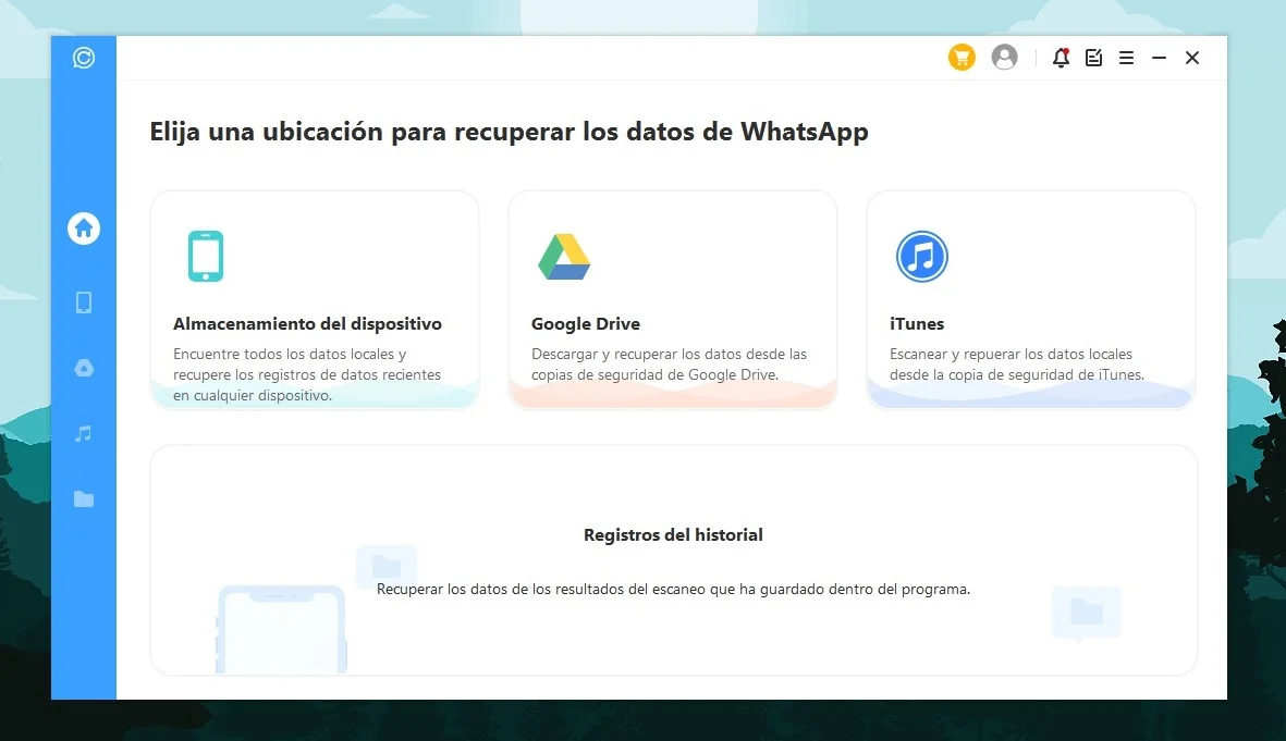 Paso 2. Elige la opción Almacenamiento del dispositivo como ubicación para recuperar los datos de WhatsApp. Este es el modo correcto para permitir que el software busque en la memoria de almacenamiento del smartphone los datos recuperables de WhatsApp cuando no posees una copia de seguridad.
